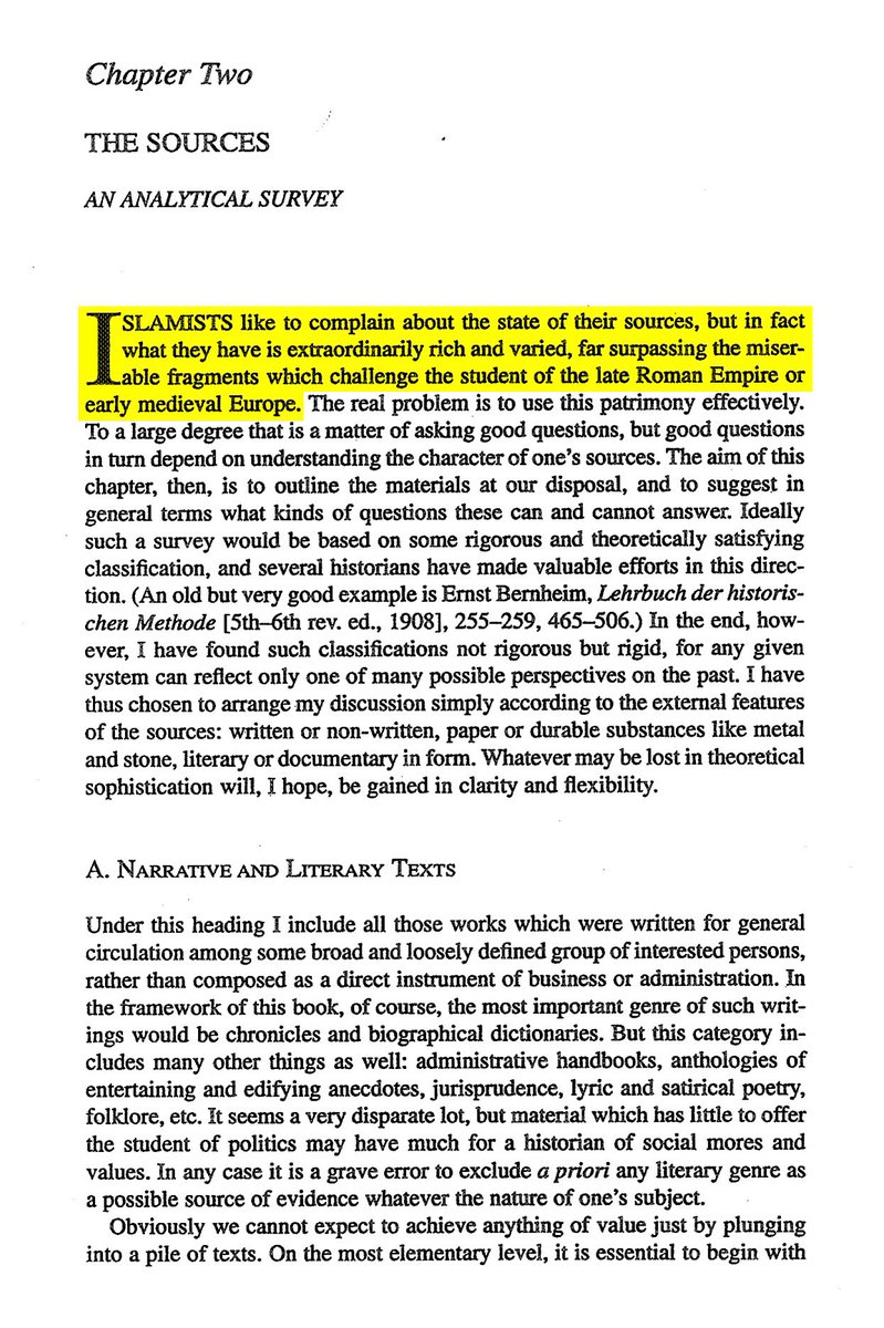 ❝Islamists like to complain about the state of their sources, but in fact what they have is extraordinarily rich and varied, far surpassing the miserable fragments which challenge the student of the late Roman Empire or early medieval Europe.❞ (p. 25)