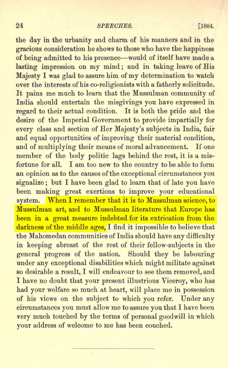 ❝ When I remember that it is to Mussulman science, to Mussulman art, and to Mussulman literature that Europe has been in a great measure indebted for its extrication from the darkness of the Middle Ages…❞ (p. 24)
