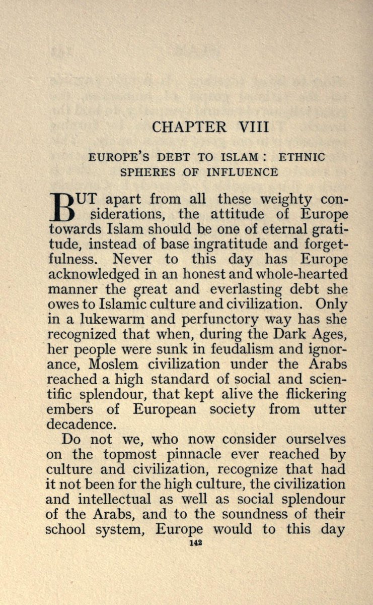 ❝Do not we, who now consider ourselves on the topmost pinnacle ever reached by culture and civilization, recognize that, had it not been for the high culture, the civilization and intellectual, as the social splendors of the Arabs and soundness of their system, Europe would to this day have remained sunk in the darkness of ignorance?❞ (p. 142)