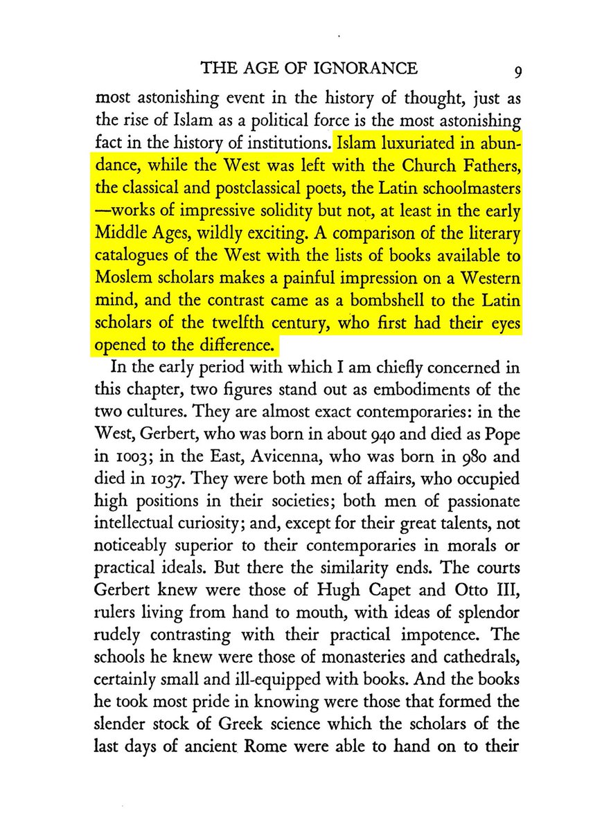 ❝Islam luxuriated in abundance, while the West was left with the Church Fathers, the classical and postclassical poets, the Latin schoolmasters—works of impressive solidity but not, at least in the early Middle Ages, wildly exciting. A comparison of the literary catalogs of the West with the lists of books available to Muslim scholars makes a painful impression on a Western mind, and the contrast came as a bombshell to the Latin scholars of the twelfth century, who first had their eyes opened to the difference.❞ (p. 9)