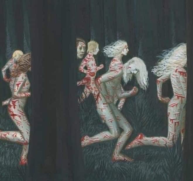 The NUDITY is three-fold: ritual humiliation, symbolically stripping the victim of their identity AND reborn as prey.