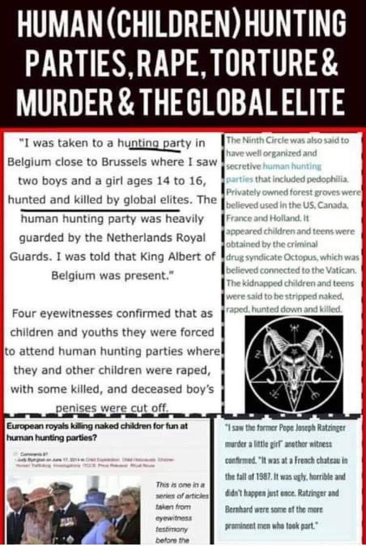 “I was taken to a hunting party near Brussels,” one survivor testified, “where I saw two boys and a girl, ages 14–16, hunted and killed by global elites. The human hunting party was heavily guarded by the Netherlands Royal Guards. I was told King Albert of Belgium was present.”