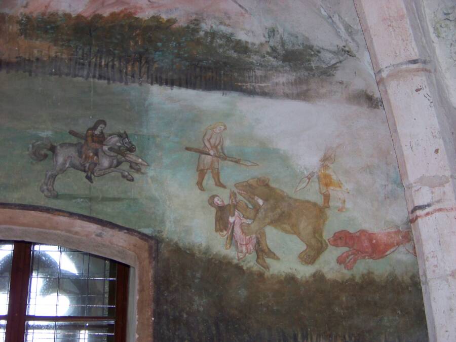 Frescoes depict a half-human, half-beast hunting a man, eerily echoing the hybrid aristocrats of The Hunt.