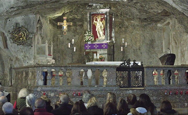 A rich landowner named Garganus lost his prize bull. Searching, he found it kneeling inside a dark cave on Mount Gargano. Frustrated, he shot an arrow, but it mysteriously turned back on him. He then went to Lorenzo Maiorano, holy bishop of Siponto, to tell what had happened.