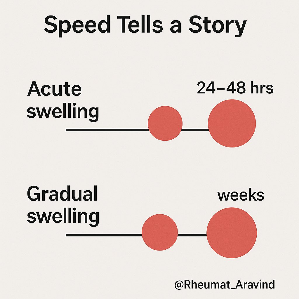If swelling peaks in 24–48 hrs → think gout, pseudogout, septic arthritis, viral arthritis.