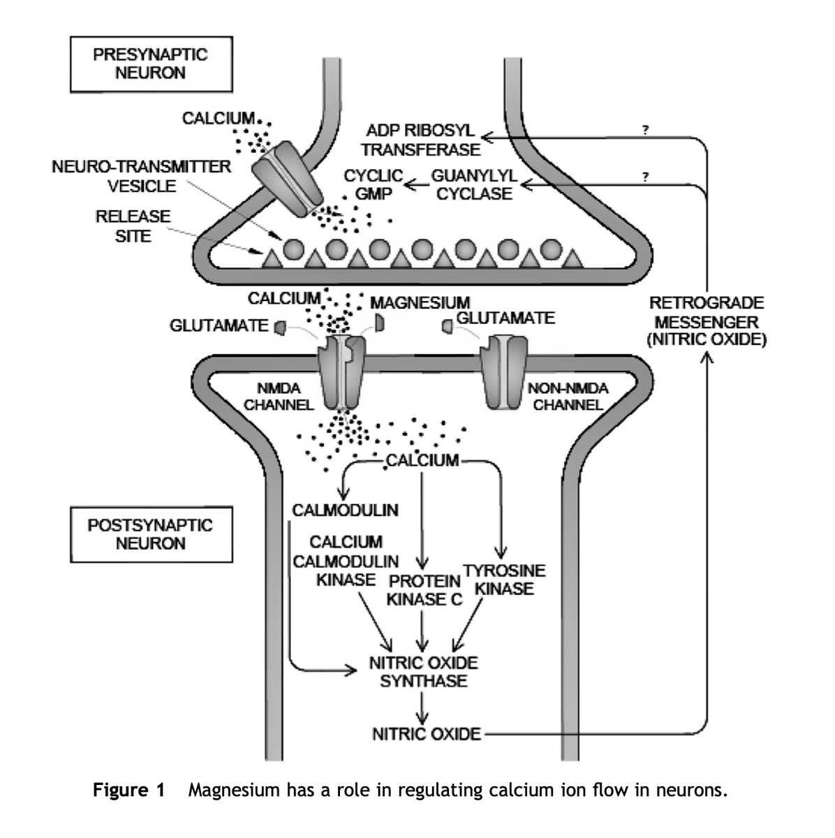 However, magnesium acts as an antagonist to calcium, preventing it from going into neurons excessively. It also directly blocks the NMDA receptor, a key glutamate receptor.