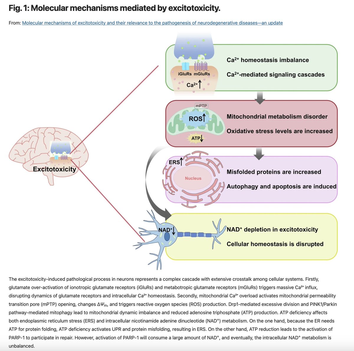 This floods the mitochondria - which opens up pores in their membranes, resulting in worsened energy production and higher reactive oxygen species.