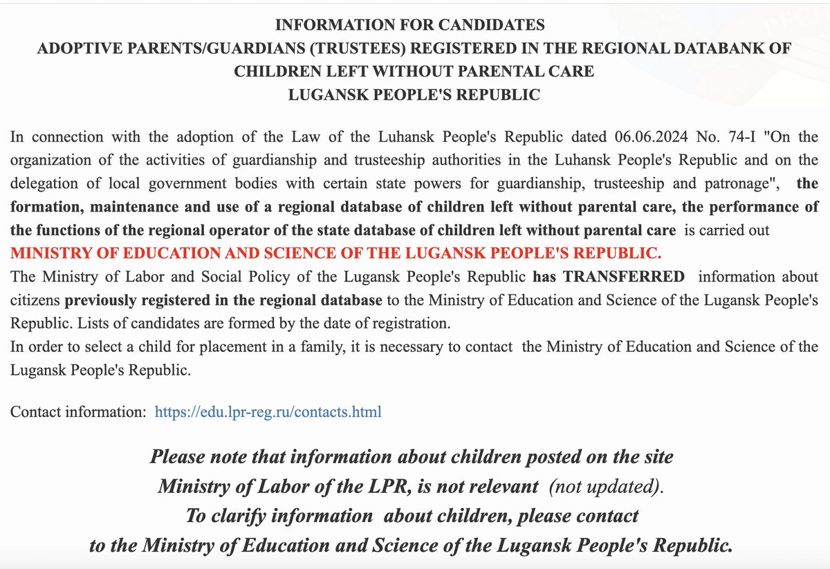 2/ The database is hosted by the Ministry of Education and Science of the 'Luhansk People's Republic', but it is not a new product. The Ministry of Labour and Social Policy previously dealt with guardianship issues but transferred this responsibility in the summer of 2024.