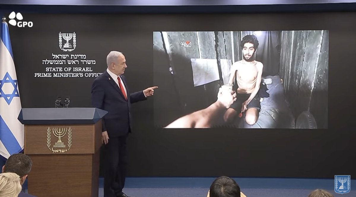 Netanyahu: The only people being deliberately starved in Gaza are the hostages. Look at Evyatar David, and look at the Hamas' captor's arm: "he's eating well."