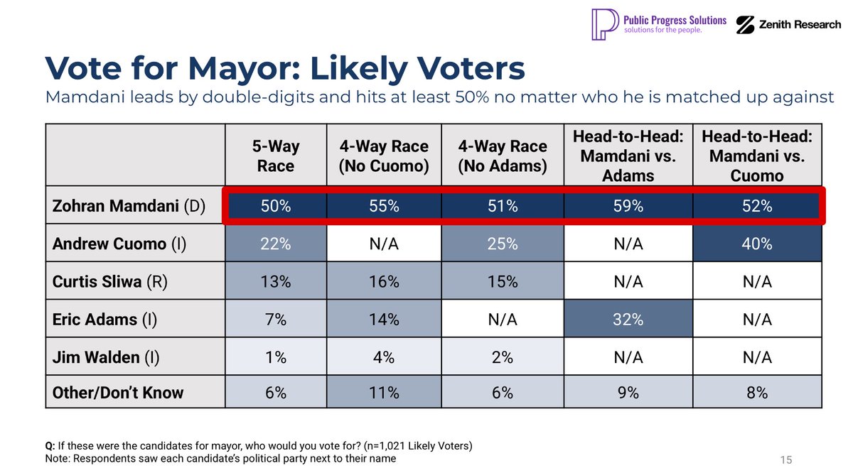🚨 🚨 A new NYC mayor general election poll from @ZenithPolls (me) & Public Progress (@amitsinghbagga) — the most comprehensive poll of the race — finds Mamdani with a commanding 28-point lead in a five-way race, and getting >50% head-to-head vs Cuomo