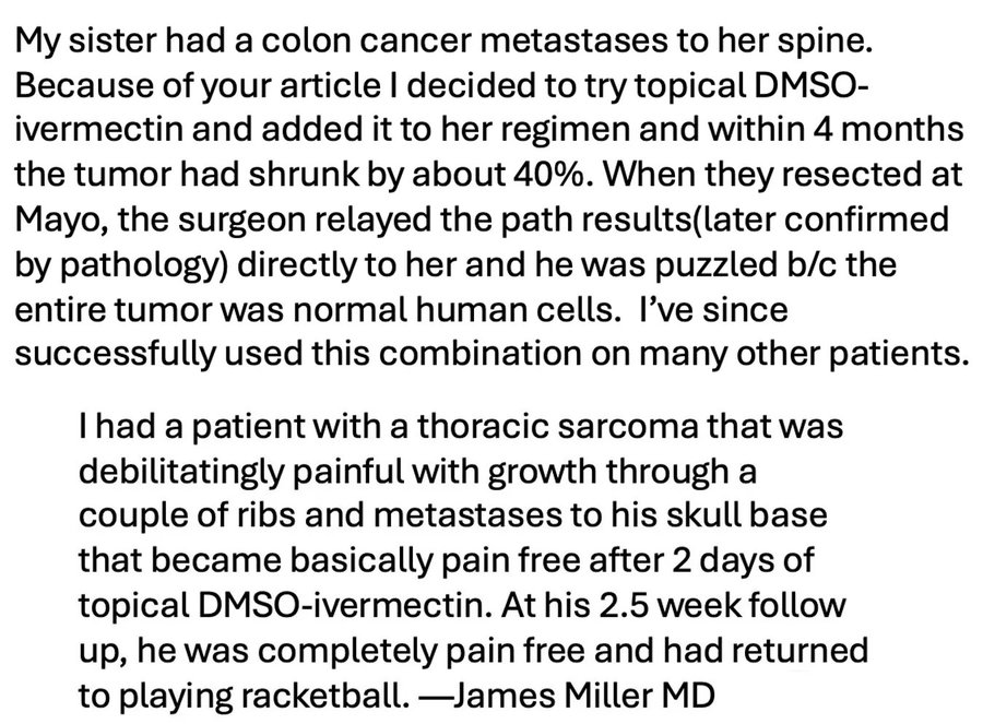 I've hence received many remarkable stories of DMSO potentiating cancer therapies. Here are two from doctors who combined it with ivermectin.