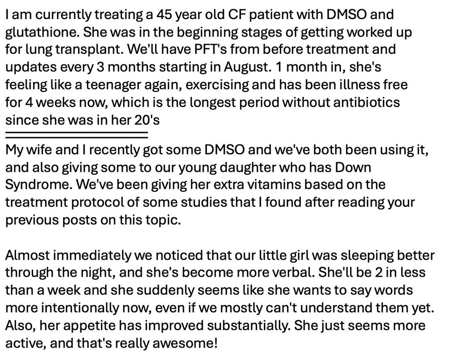 Here readers shared DMSO treated Cystic Fibrosis and Down Syndrome, both "incurable" conditions.