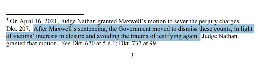 After Maxwell is sentenced, DOJ dismissed the two remaining perjury counts "in light of victims’ interests in closure and avoiding the trauma of testifying again."