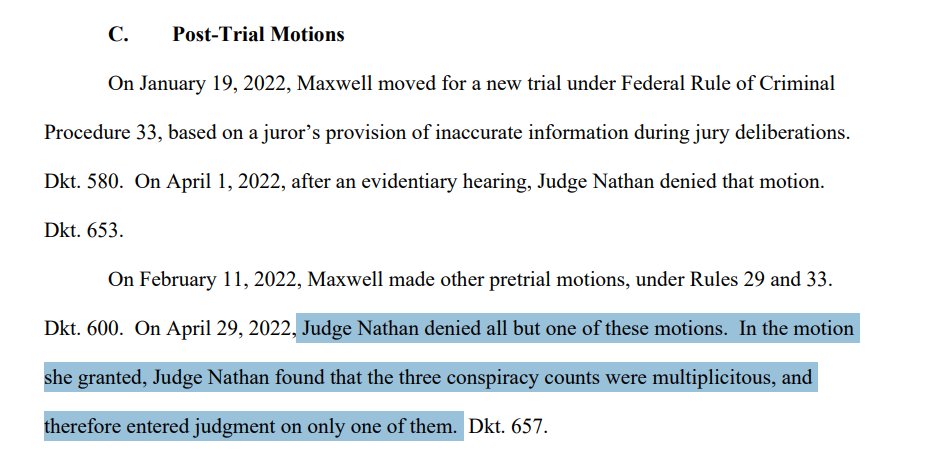 Only one was granted, that concerning the conspiracy charges being multiplicitous. Basically, Counts 1, 3, and 5 were seen by Judge Nathan as being for the same illegal acts (the conspiracy with Epstein).