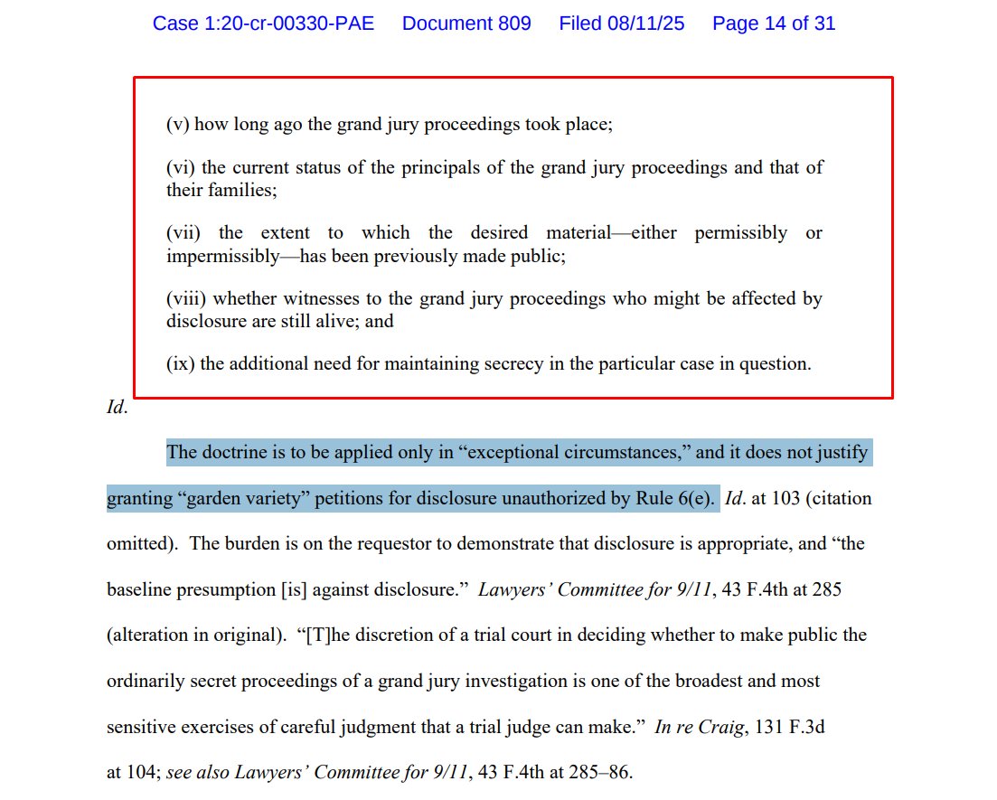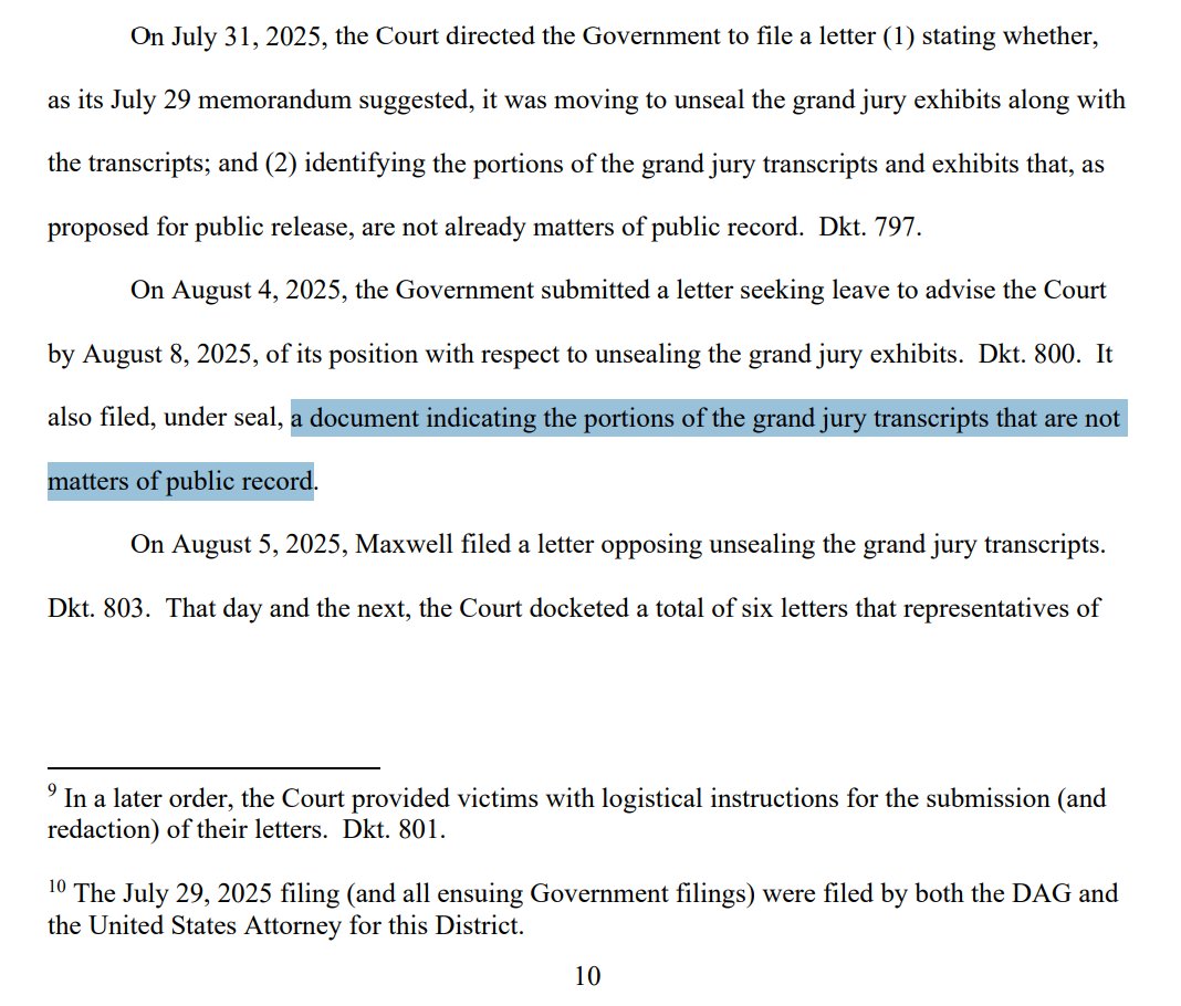July 31, 2025- Judge asks DOJ if they want to unseal the exhibits as well AND directs DOJ to identify "the portions of the grand jury transcripts and exhibits that, as proposed for public release, are not already matters of public record."