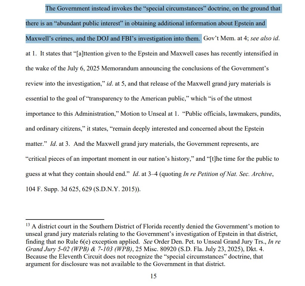 "The Government’s invocation of special circumstances, however, fails at the threshold. Its entire premise—that the Maxwell grand jury materials would bring to light meaningful new information about Epstein’s and Maxwell’s crimes, or the Government’s investigation into them—is demonstrably false."