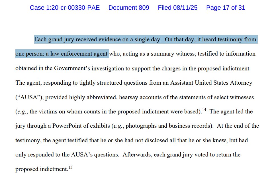 They hear from a single witness, an FBI agent, who testifies for 1hr 25mins. The transcript is 74 double spaced pages. Two exhibits are used, one a PowerPoint presentation and the proposed indictment.
