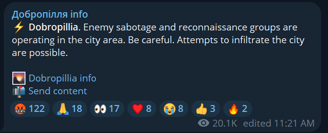 A telegram channel from Dobropilla say sabotage groups may be operating inside the city.