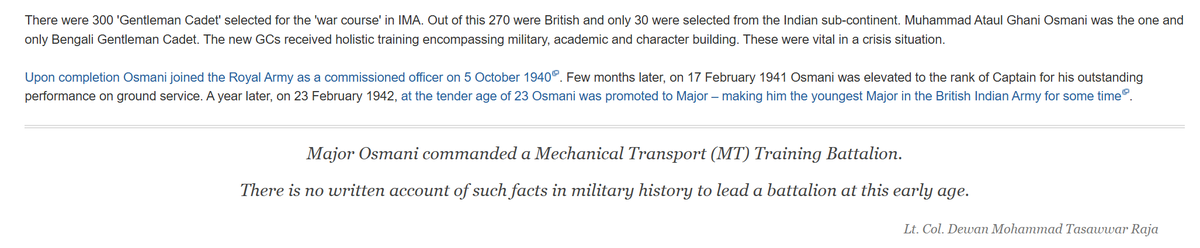 Osmani joined the IMA in 1940. He was selected out of a course of 300, where 30 were Indian, and he the sole Bengali. Commissioned in the royal army in Oct 1940, Captain by Feb 1941, and Major by Feb 1942, the youngest ever Major in the British Indian Army.