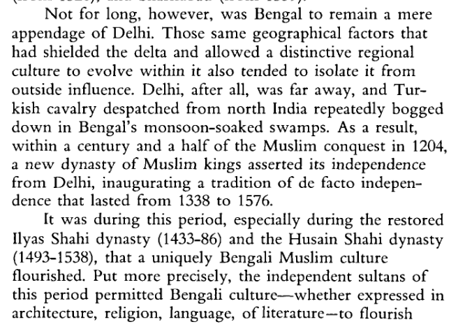 Bengal gained independence during the reign of Shamsuddin Ilyas Shah Bangra (1338-1357). With this came a greater insulation of Bengal’s new Islamic elite, and Ilyas Shah derived much success due to his integration of native Bengalis in his administration, military, and court.