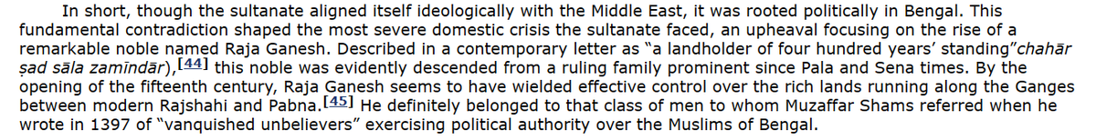 Ganesha was locked in A power struggle with the Muslim faction, led by the Bengali Sufi saint Nur Qutb Alam. Allegedly, Ganesha oppressed the Ulema, pushing Nur Qutb Alam into petitioning Ibrahim of Jaunpur into invading Bengal.