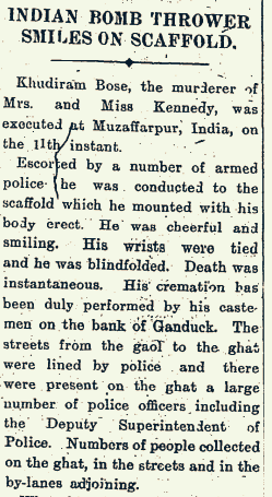 “At Muzaffarpur, at six o’clock in the early morning on August 11, Khudiram was executed. He walked to the gallows with firm steps and a calm mind. Even when the noose was placed around his neck, he was still smiling.” 18/19