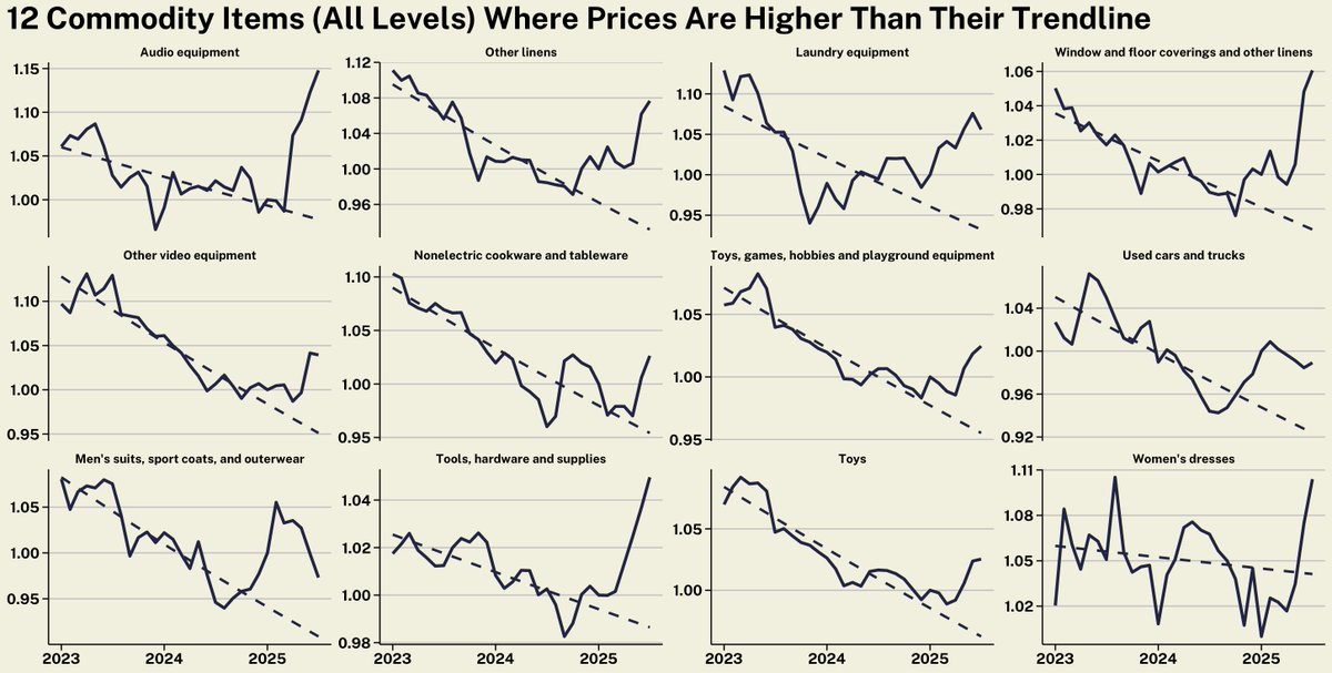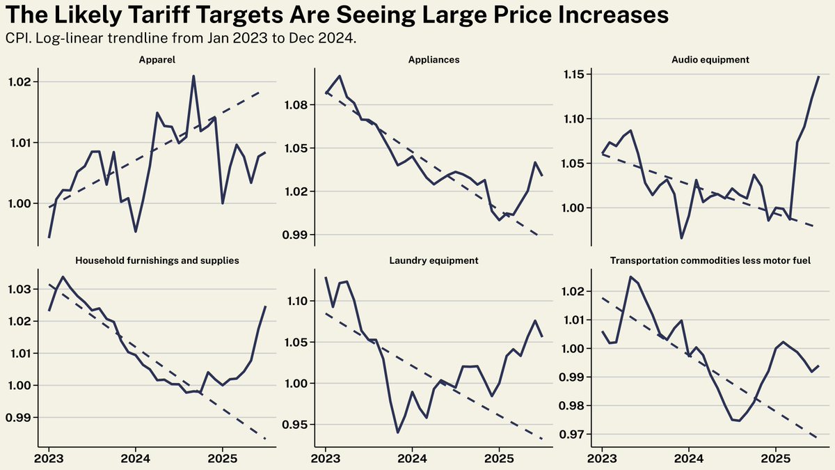 Meanwhile, tariffs are doing tariff things, with preregistered categories seeing prices increase, especially from trend. (Apparel is a notable exception.)