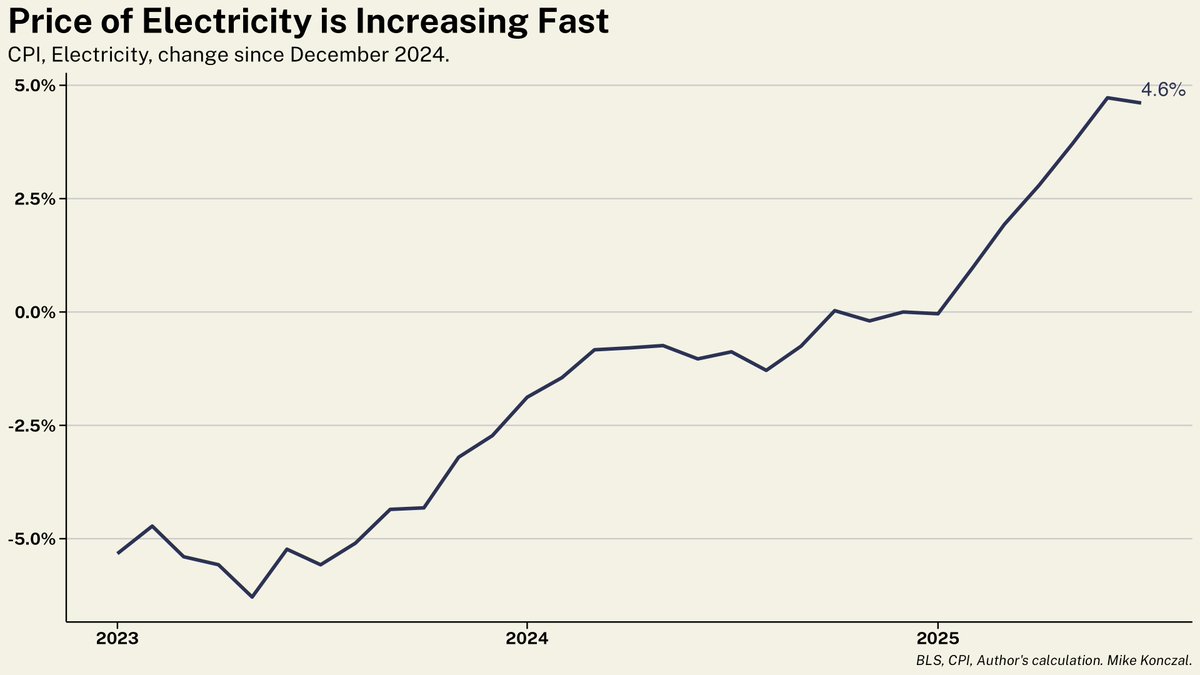 Energy slowed in July, bringing down headline vs core, but it's been increasing fast in 2025. Here's the price index for electricity. It took two years, 2023-2024, for it to increase 5%. It's increased ~5% so far this year.