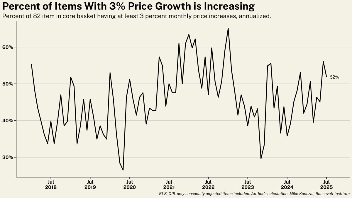 Meanwhile inflation is broadening. Here's percent of items that had at least a 3 percent (annualized) price increase over the last month, something Waller used to flag the 2023 disinflation.