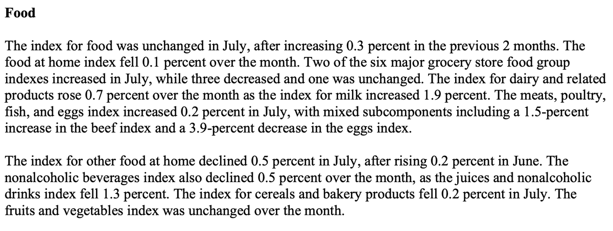 Breaking down groceries: dairy rose 0.7% (milk +1.9%), meats/poultry/fish/eggs rose 0.2% with beef up 1.5% and eggs down 3.9%.