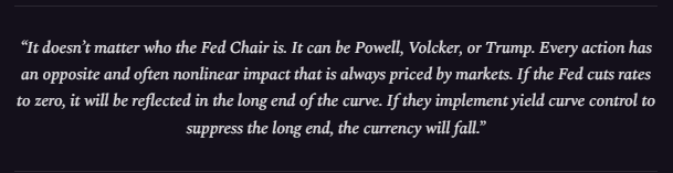 So we remain in melt up mode where stocks are skewed to the upside and bonds are skewed to the downside. And like I already laid out, it doesnt matter who the Fed chair is, if they cut rates into this environment, the long will blow out to push them back into line.