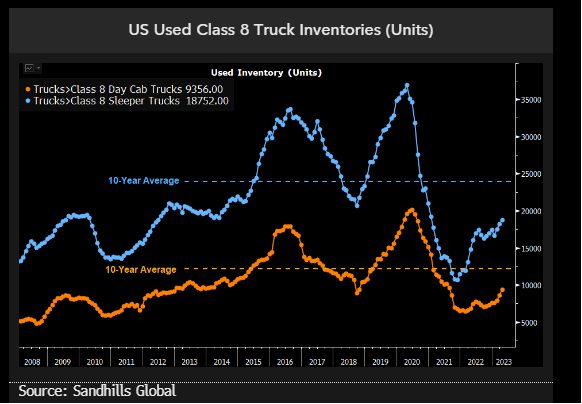 3/ Meanwhile, Used Class 8 inventories are increasing (although still below 10 year averages, the the direction of travel and rate of change are negative):