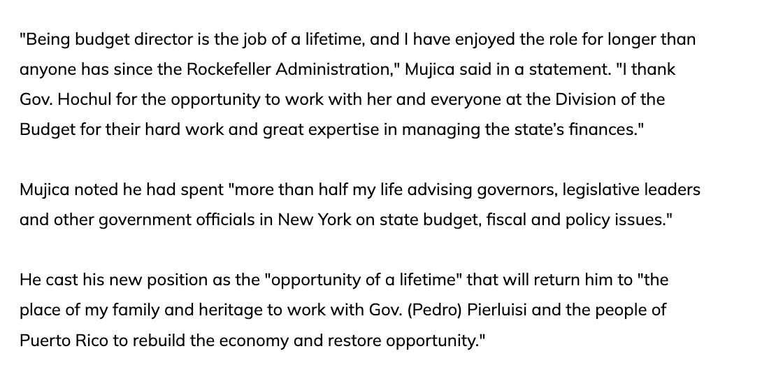 Mujica served as Cuomo's NY budget director, earning 216K/year. He would get offered a position on Puerto Rico's state fiscal board, wherein his salary would triple to 625K. This despite that Puerto Rico has a population of 3.2 million, far less than NYC's population of ~8.8 million.