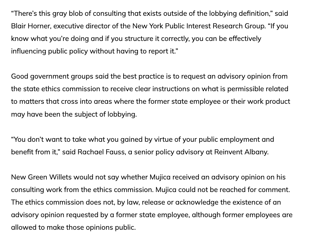NYC watchdogs ceded that Mujica was in a "gray area" regarding lobbying restrictions on former state officials.