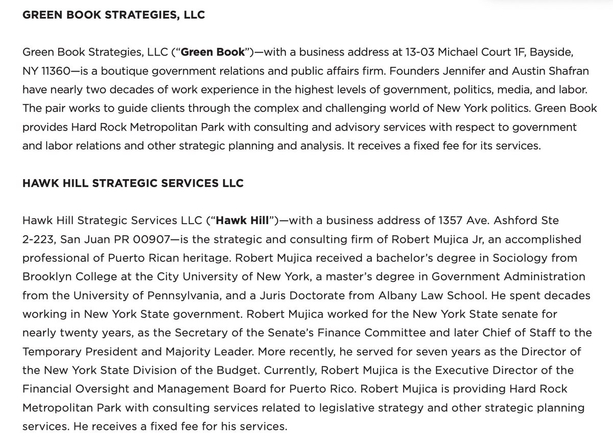Hard Rock in 2025 outright states that it is paying Mujica a "fixed fee" for "providing legistative strategy and other strategic planning services." While in his Puerto Rico role.