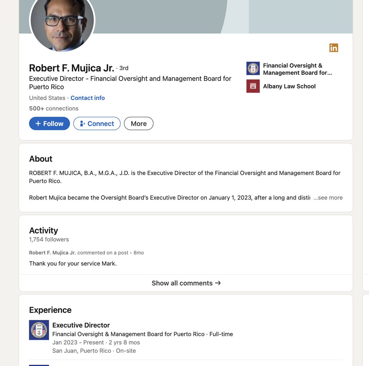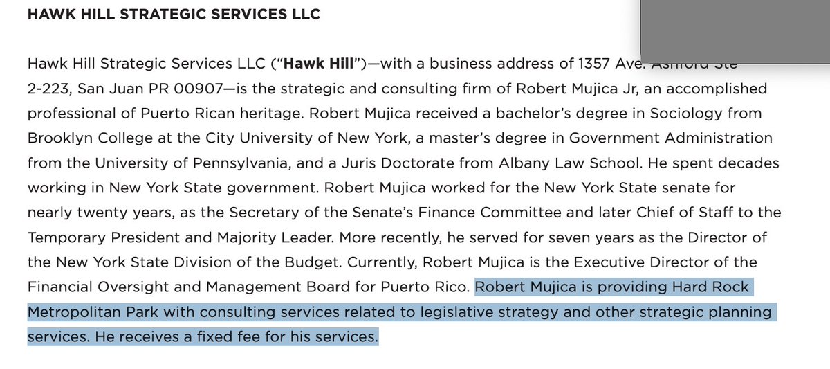 If the 625K salary of being PR's Oversight Board’s executive director on January 1, 2023 wasn't enough - Mujica would go onto establish a consulting service (Hawk Hill) which offered consulting for Hard Rock Cafe of all companies. His LinkedIn gives no indication that he stepped down from this role to serve in this consulting position.