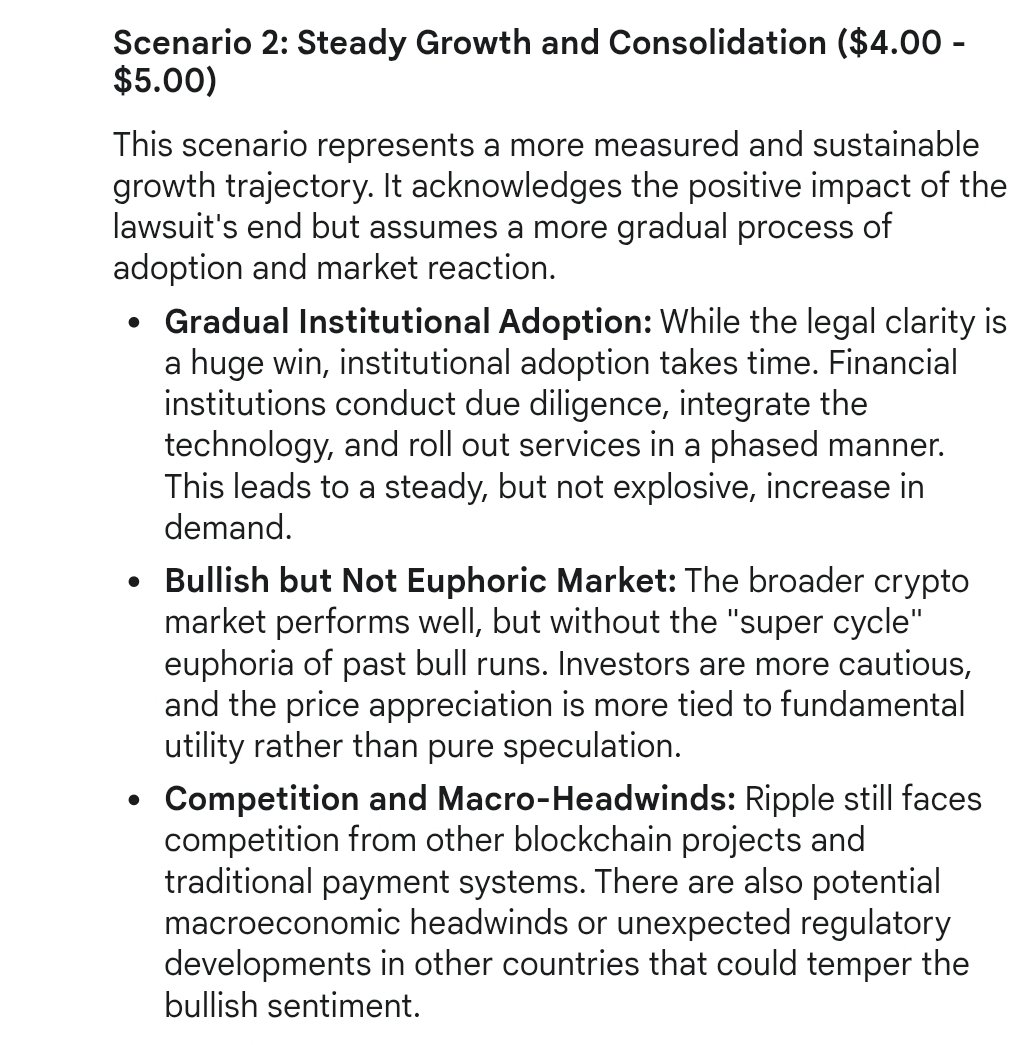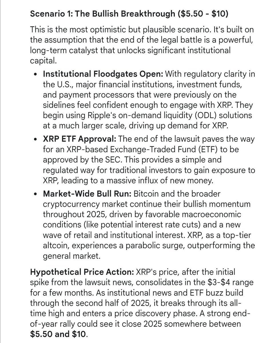 Specifically, in the first scenario, which is its bull case, Google Gemini sees XRP soaring to the $5.50 to $10 range by December 2025. According to the chatbot, in this scenario, the end of the lawsuit leads to a new wave of institutional capital.