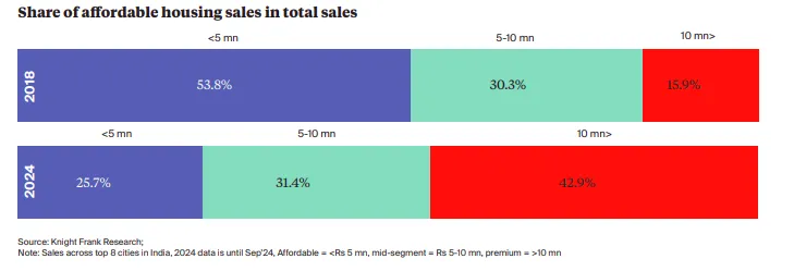 Since COVID, buyers want larger homes, that extra work-from-home room became non-negotiable. Premium and luxury segments capture increasing market share while affordable housing share shrinks. You make more selling 50 apartments at ₹2 crores than 200 at ₹50 lakhs.