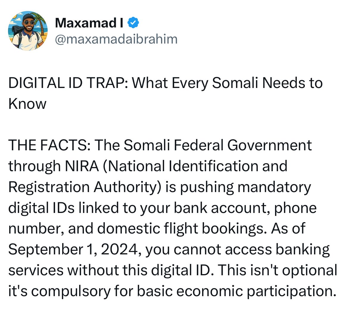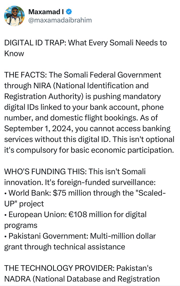@maxamadaibrahim , Welcome to reality; in every country, you need valid ID to open a bank account, fly, or get a SIM card. Somalia isn’t being singled out, without ID, you’re invisible to the system.”