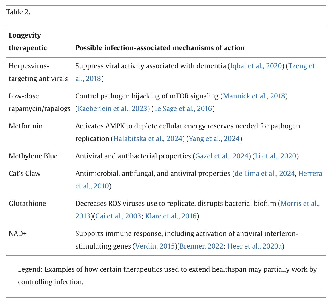4/ Indeed, because many pathogens dysregulate mTOR, AMPK, or related immunometabolic signaling, #healthspan interventions such as low-dose rapamycin, metformin, and NAD+ that target such pathways may exert part of their effect by controlling persistent infection.