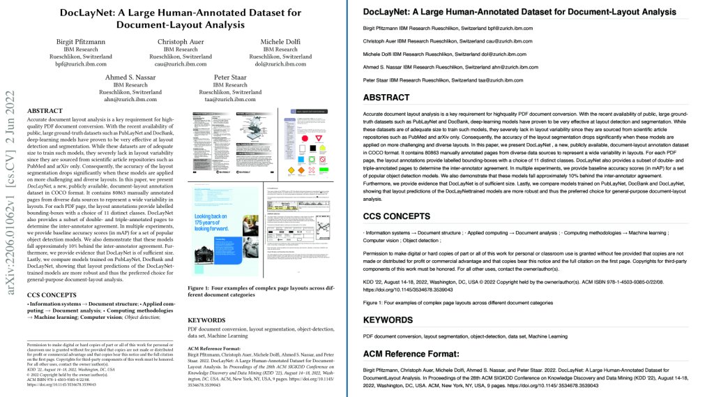 Here is an example of the DocLayNet paper from arXiv, converted into Markdown format by Docling.