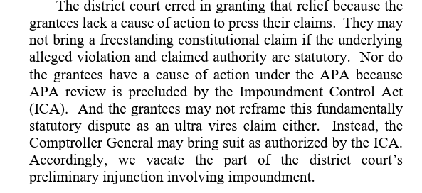 Well that order is gone, at least for now. The D.C. Circuit reversed Judge Ali today, holding that the plaintiffs do not have a cause of action to litigate impoundment. Here's the key para. 10/