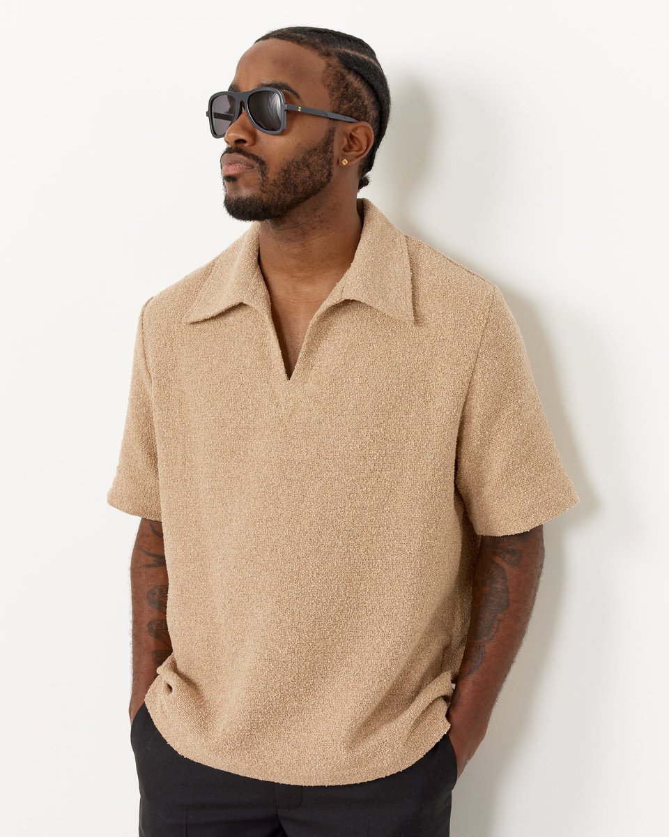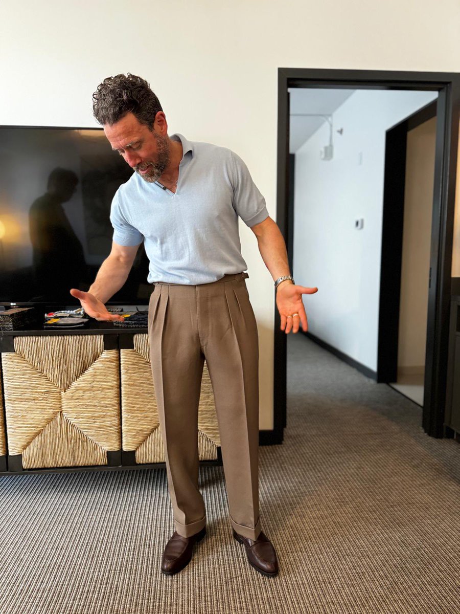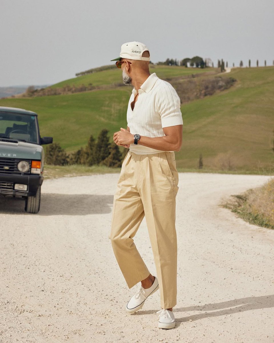 Here is yet another example: a slightly textured polo with a deep placket and skipper collar paired with a woven belt and full, high-rise pleated trousers (shape, drape, natural materials). IMO, this looks better than the low rise chino with tech polo on the right.