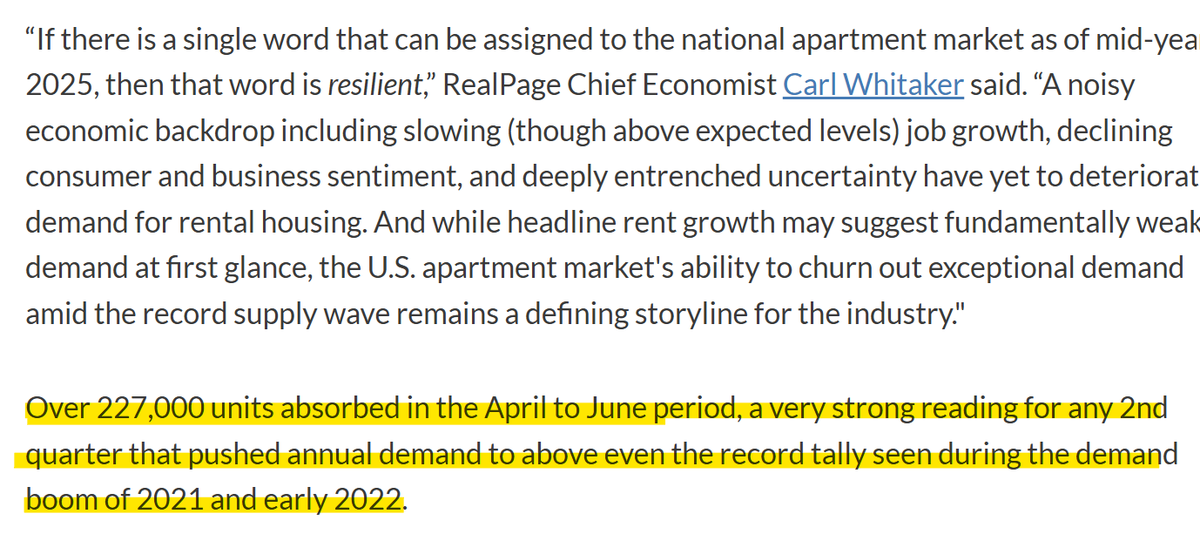 3) According to RealPage, there were 227k apartment units absorbed in Q2 2025, which was above last year.