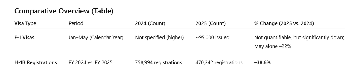 6) There also appear to be declines in the number of student and H1B visas issued so far in 2025 compared to 2024, at least according to ChatGPT.