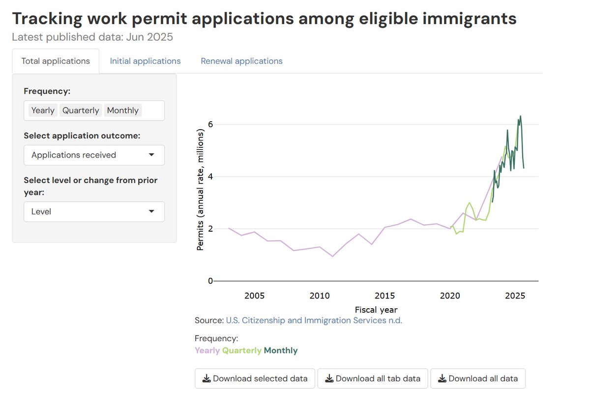 As of June 2025, there were over 4 million seasonally adjusted, annualized work permit applications from immigrants.