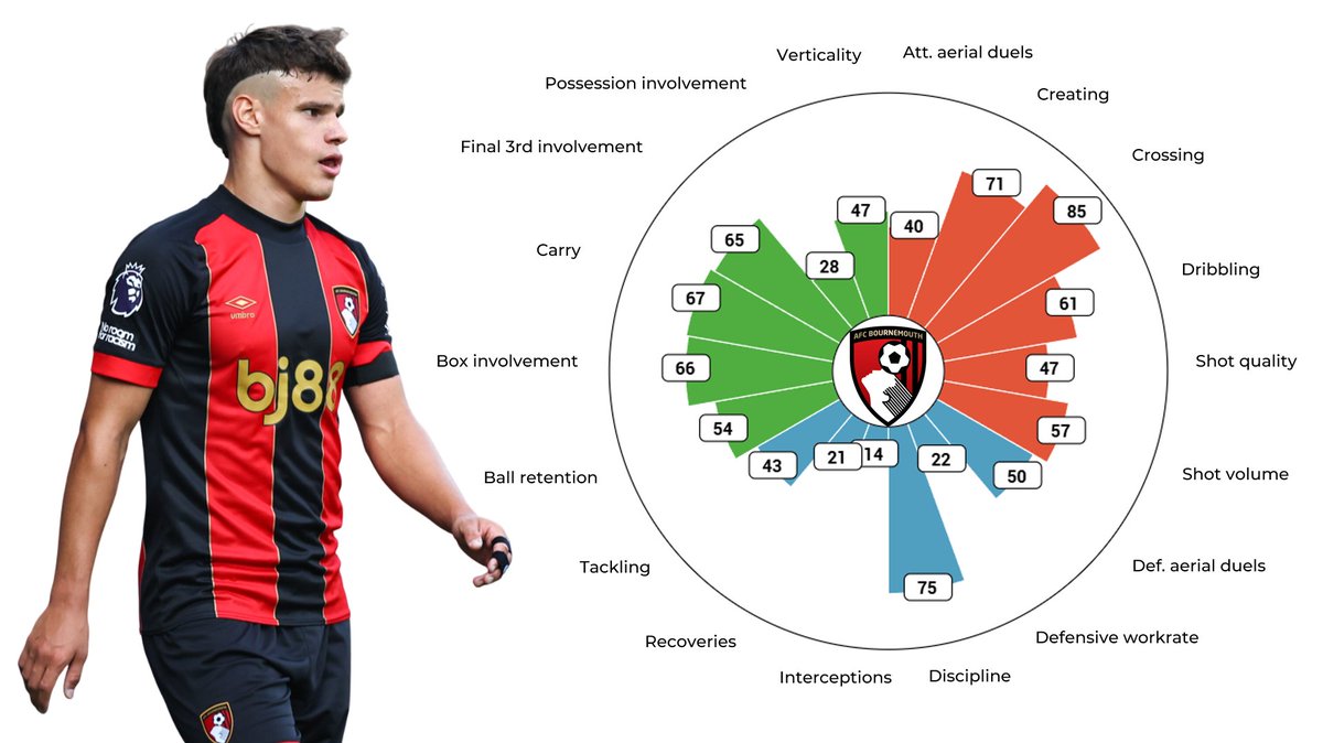 Compared to his positional peers in the #PL this season, #Kerkez's main strengths are clear to see: creating & crossing + carry, box/final 3rd involvement. Based on the underlying numbers, he is a typical advanced & proactive LB, who can support the attacks very well. 👏