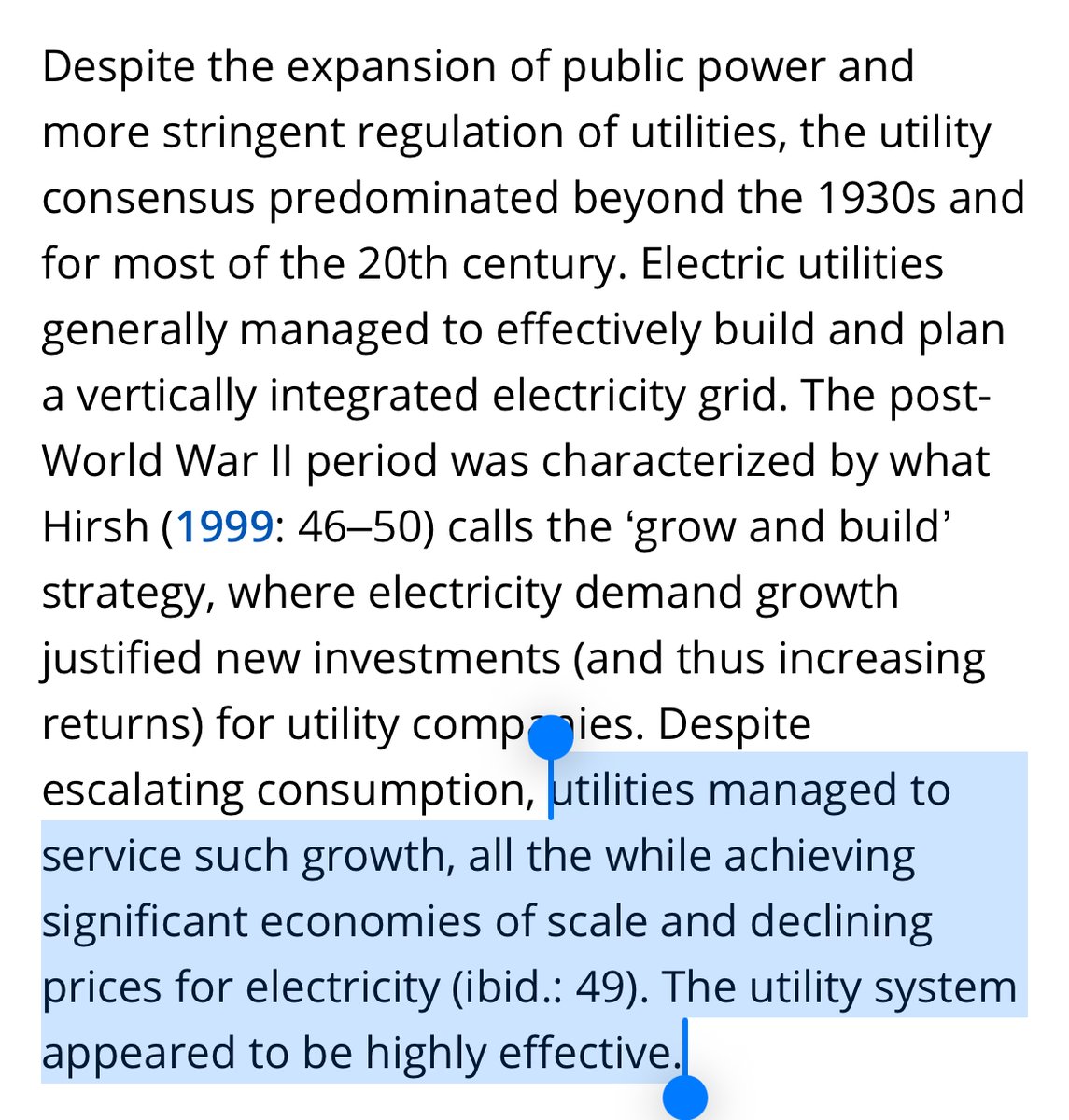 Utilities built the 20th Century grid effectively, at low cost, but by the 1970s they became a villain of neoliberal ideology. Like unions/govt they were seen as barriers to market competition. 4/x