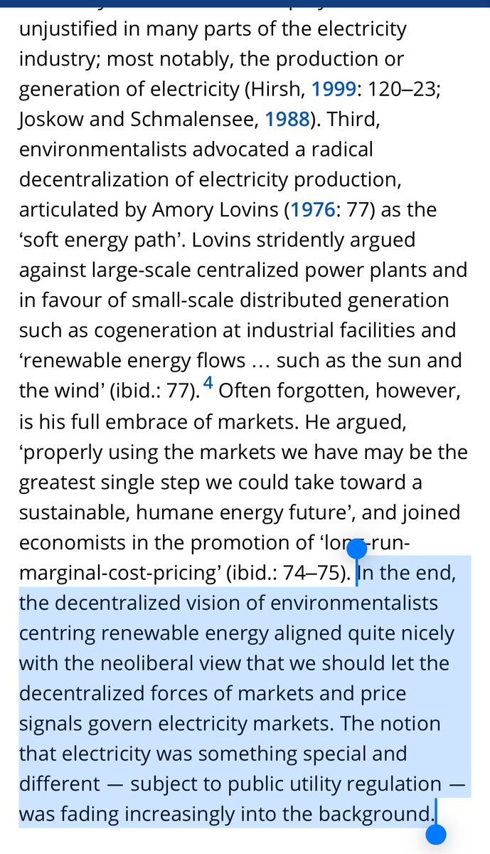The coalition that emerged arguing for electricity deregulation was diverse including industrial capital seeking lower electricity costs, neoliberal economists, and environmentalists, like Amory Lovins, who idolized small-scale decentralized energy generation. 5/x