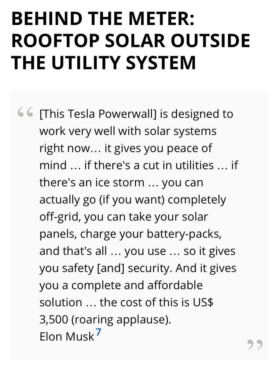 Here's Elon Musk in 2015 claiming w/ solar panels + his Tesla Powerwall, households can exit the utility system & go off grid (narrator: no you can't). 8/x